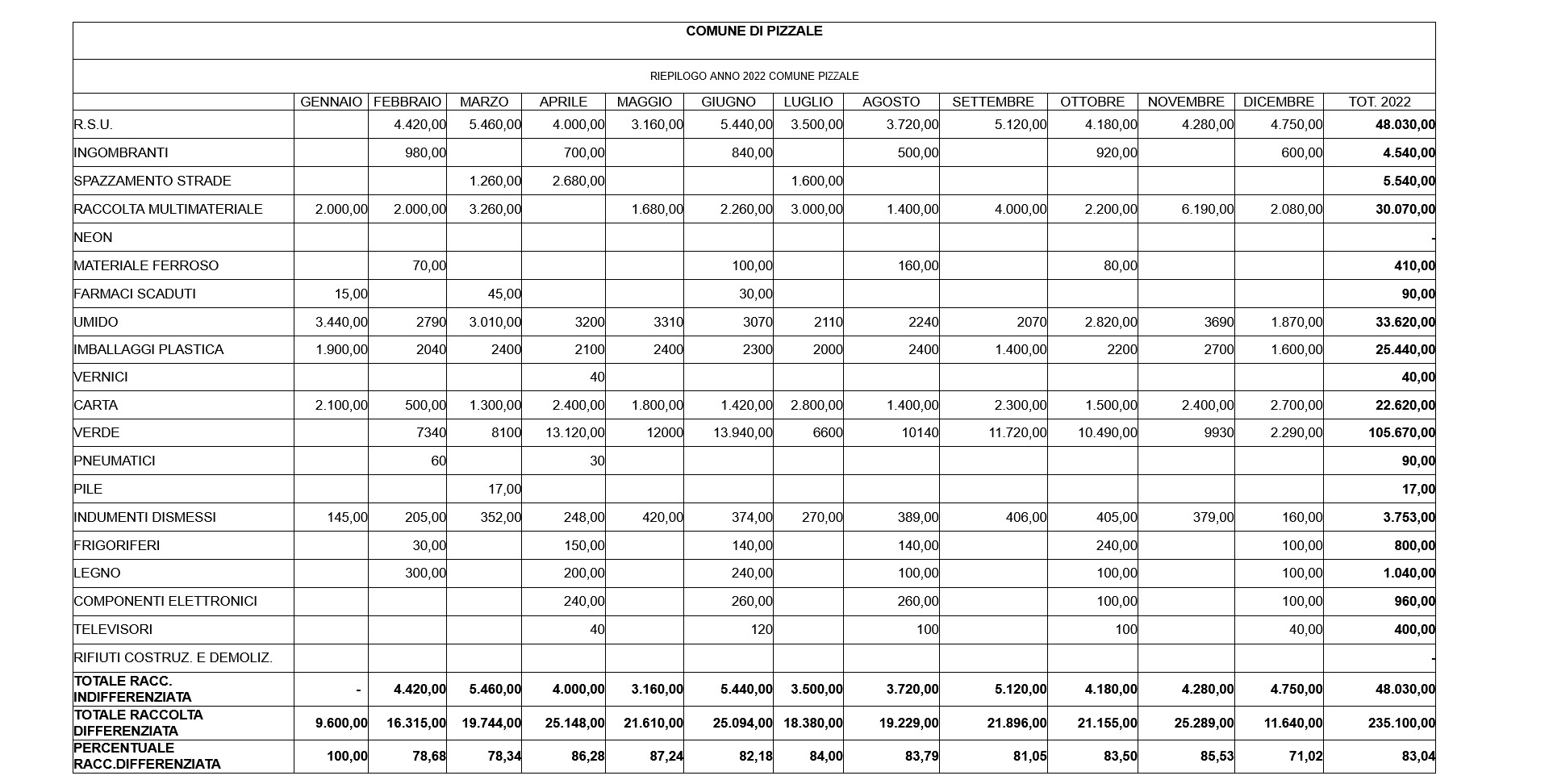Produzione e raccolta differenziato dei rifiuti urbani. Dati sui quantitativi di rifiuti prodotti e raccolti in modo differenziato nel Comune di Pizzale nel corso del 2022.